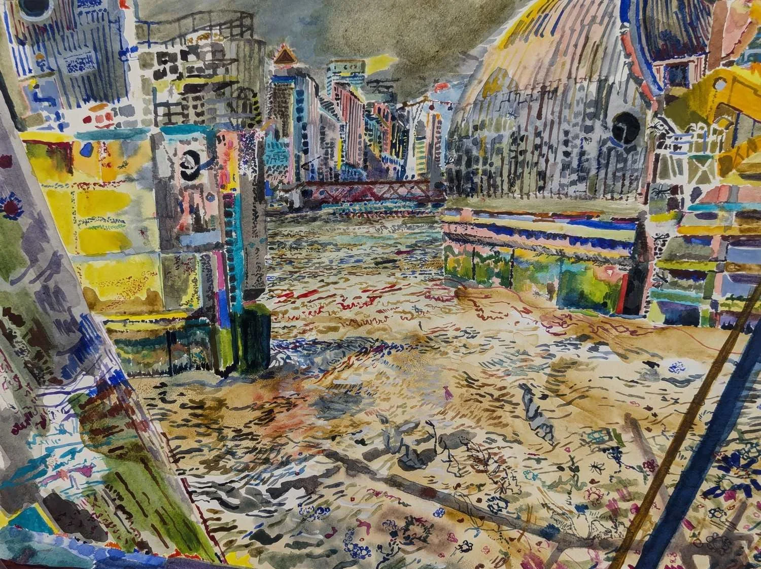 ‘Rising Tide is part of a new series of watercolours I'm currently making exploring the interactions between river, weather, industry, human and more-than-human life taking place in the area surrounding the Thames Barrier.
