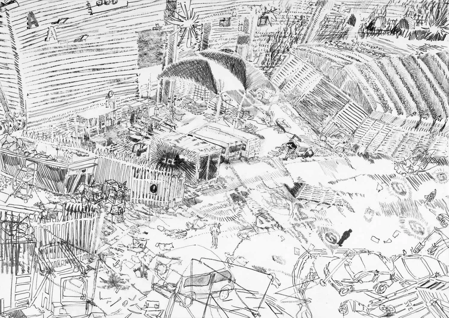 Here’s the first one ‘Act’, part of a series of drawings made looking down onto the endlessly fascinating activity in the industrial estate beneath my fifth-floor studio window.