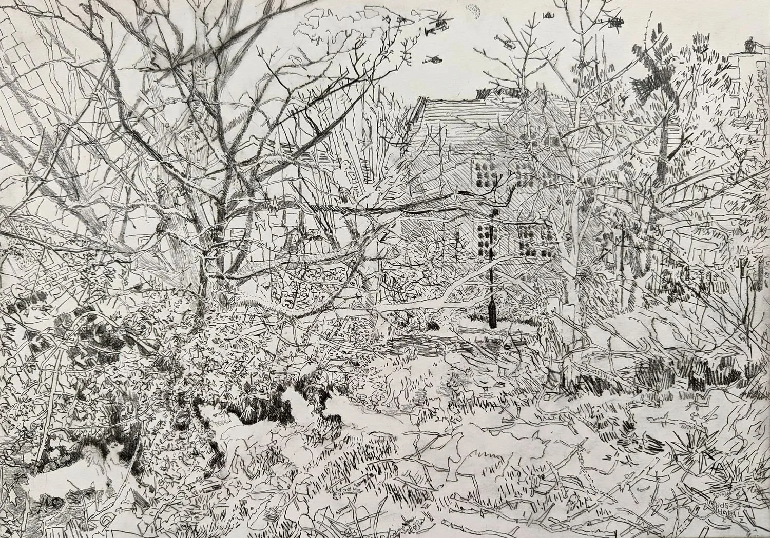 I’m constantly amazed by how a modest urban green changes radically with each season and reveals so much. This drawing was made in February. Such a great opportunity to draw ‘sleeping’ trees and to see the continued activity of creatures who’ve made Laycock Green their home. I wanted to take advantage of being able to look really closely at the structure of the bare branches. I was especially fascinated by the way the horizontal branches reach out into the open space in the centre of the Green, as if feeling their way towards new territory.